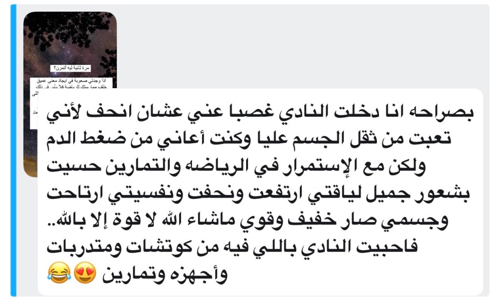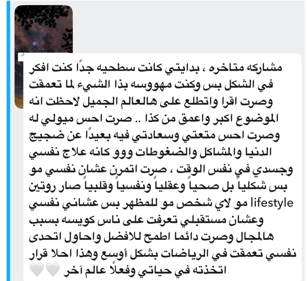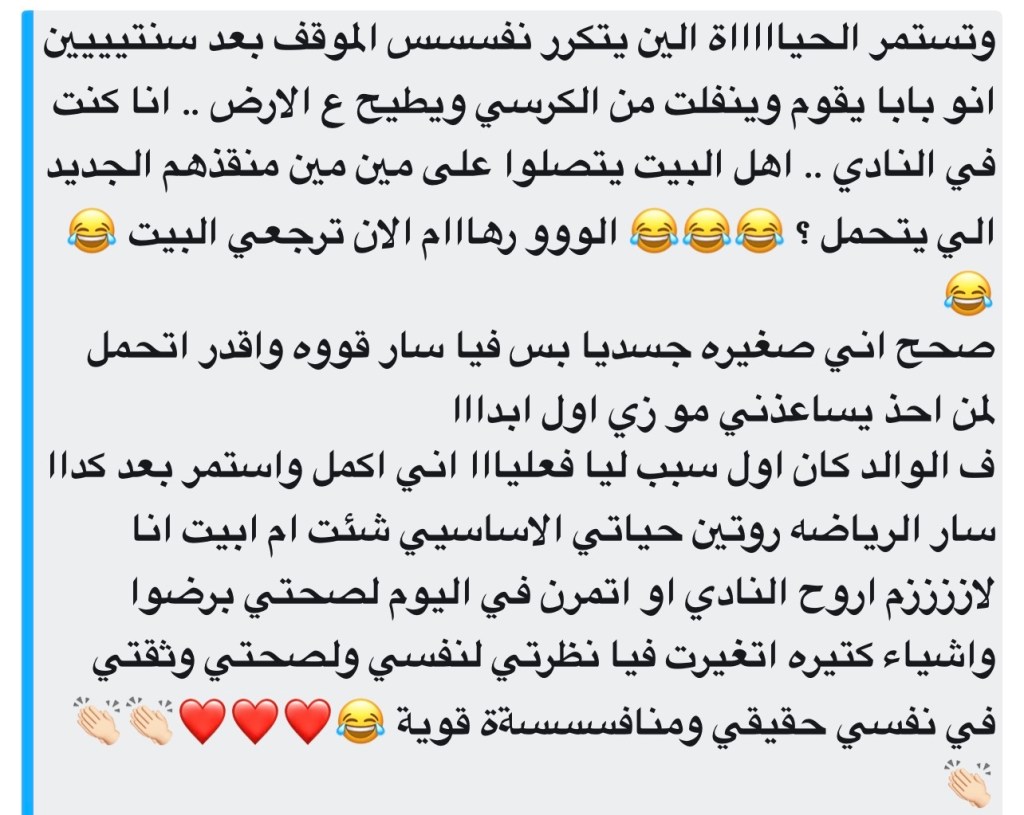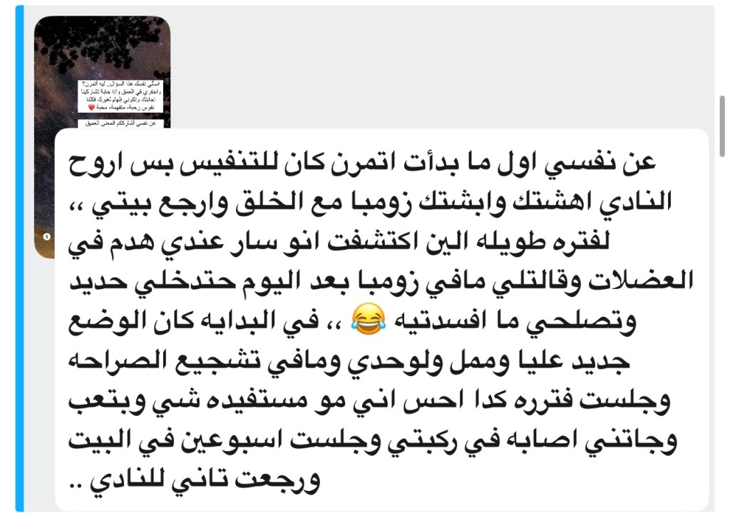 وفي سؤالي عن السبب/المعنى خلف ممارسة الرياضة، ثمة إجابة لامستني جدًا وكانت سببًا في تفاعل البقية الكبير ومشاركة إجاباتهم. تحكي فيها صاحبتها…