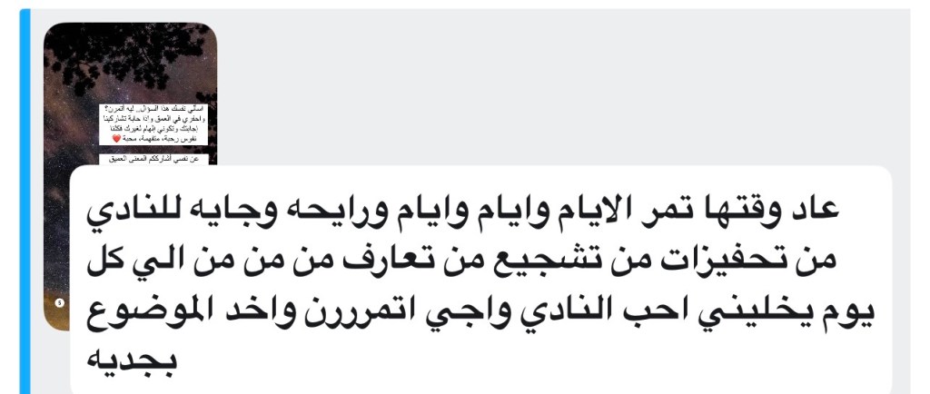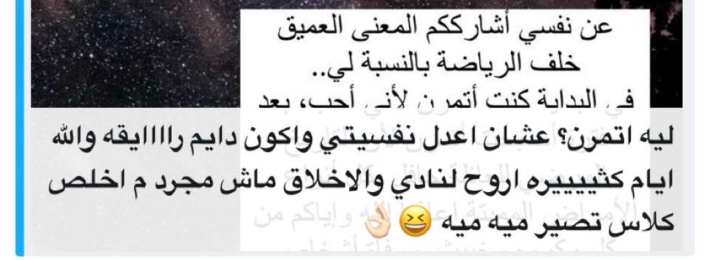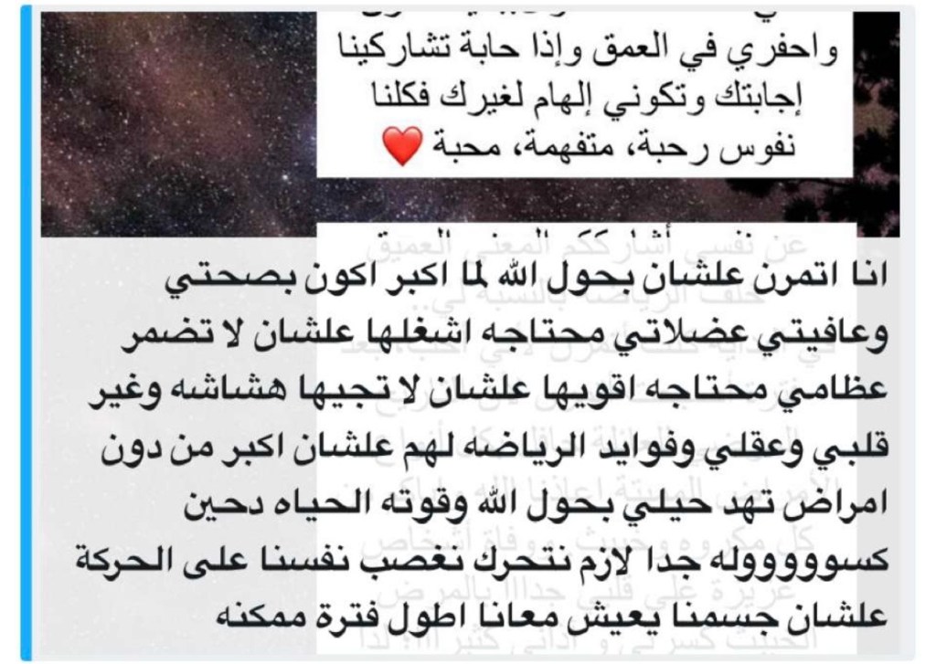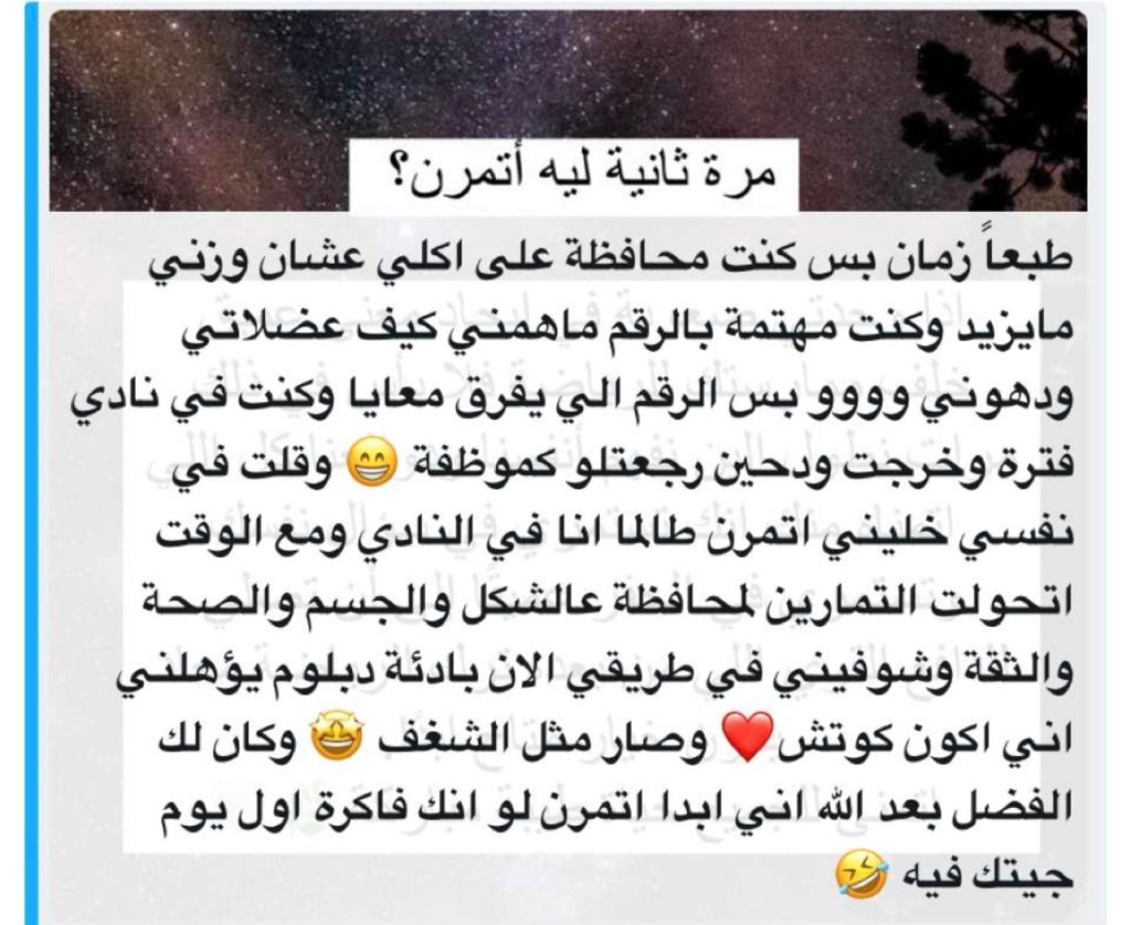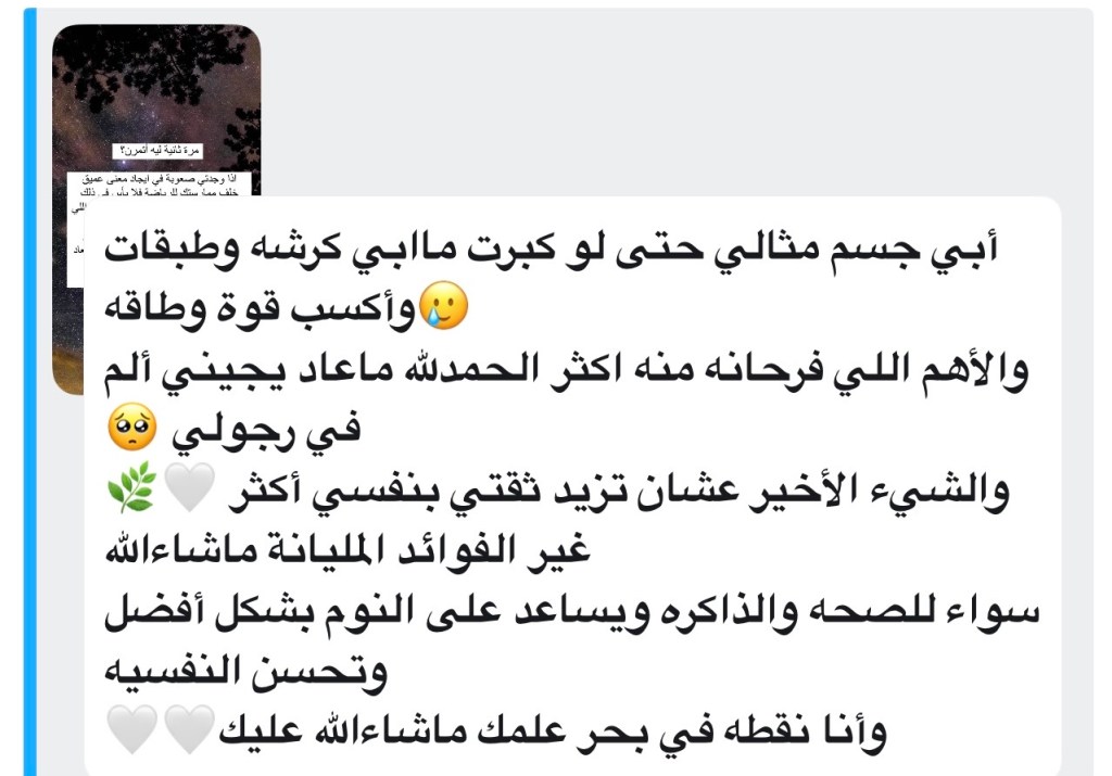 وفي سؤالي عن السبب/المعنى خلف ممارسة الرياضة، ثمة إجابة لامستني جدًا وكانت سببًا في تفاعل البقية الكبير ومشاركة إجاباتهم. تحكي فيها صاحبتها…